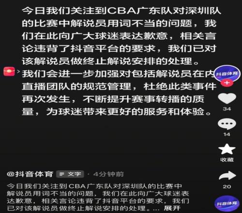 憤怒的廣東球迷開始投訴,于是抖音官方趕緊公開道歉,宣布解雇這個解說,并且向廣大球迷致歉。