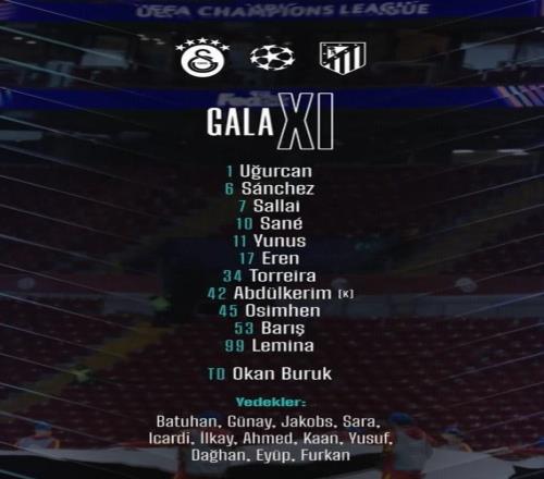 加拉塔薩雷首發:1-恰基爾、17-埃爾馬利、42-巴爾達克奇、6-達文斯-桑切斯、7-羅蘭-紹洛伊、34-托雷拉、99-勒米納、10-薩內、11-阿克金、53-伊爾馬茲、45-奧斯梅恩